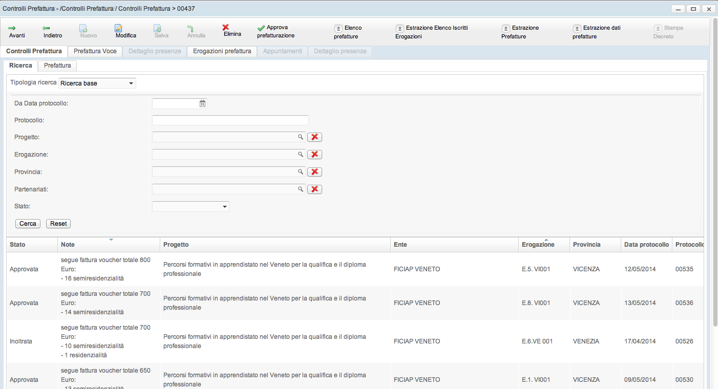 Il pannello "Controlli prefattura" fornisce una maschera di ricerca delle prefatture inserite. Si può notare la presenza della colonna delle note, dove l'utente regionale può inserire degli appunti sulla prefattura in questione.