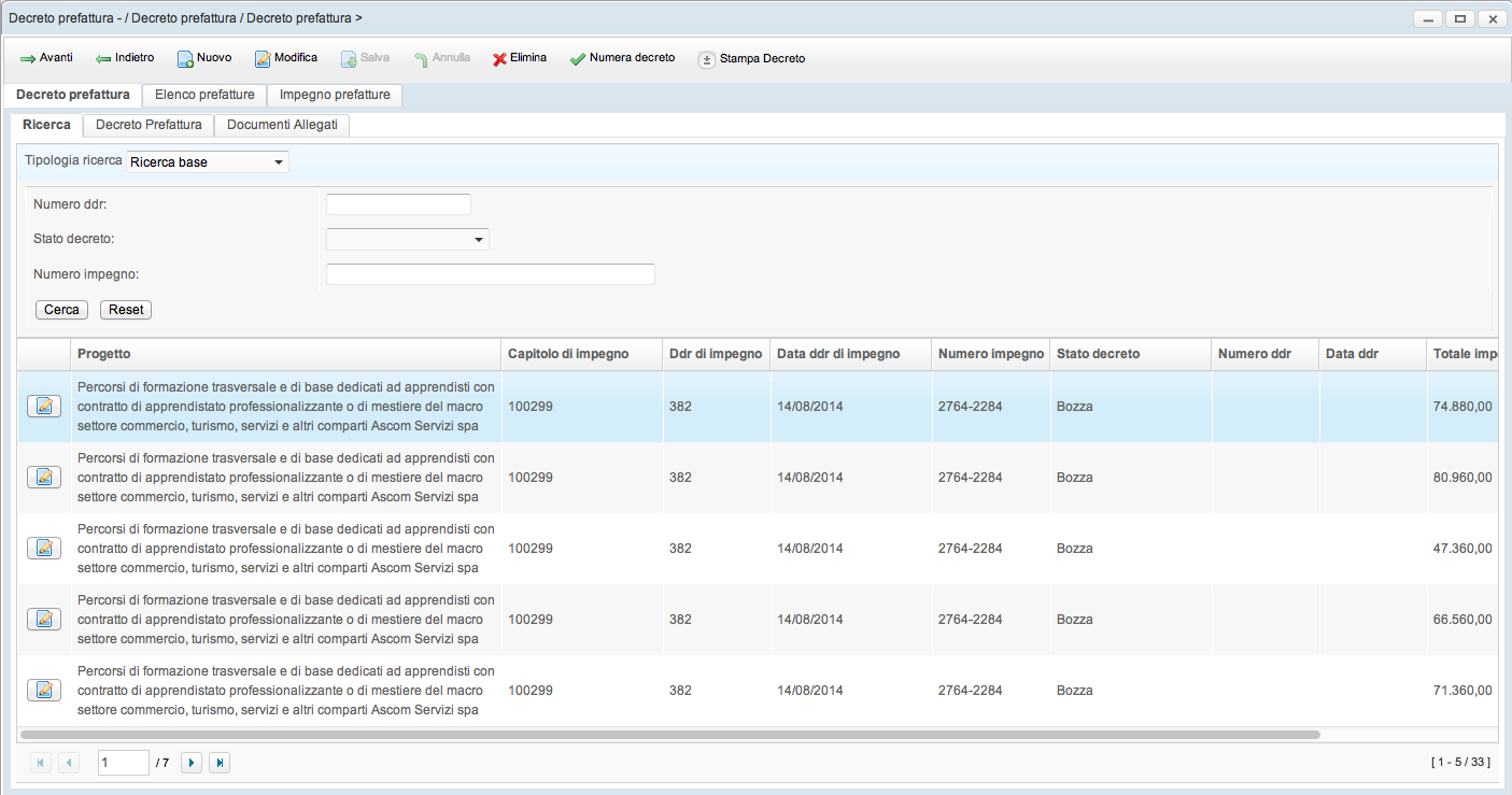 Il pannello "Decreto prefattura" propone una maschera di ricerca per i decreti già creati e permette la creazione di nuovi decreti.