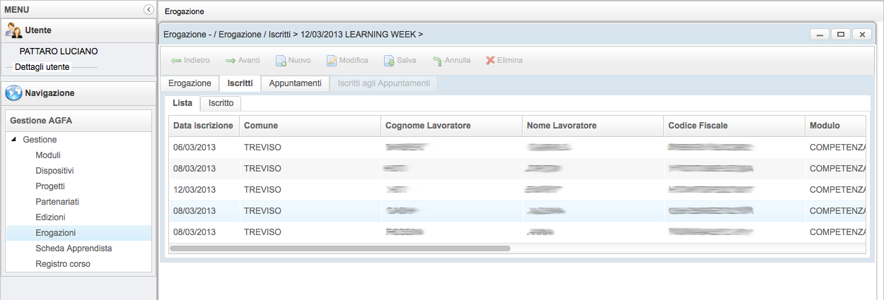 Nel pannello Iscritti vengono riepilogati tutti i componenti dell'erogazione. La pagina ha solo valore riepilogativo per cui sono disabilitate tutte le attività di modifica.