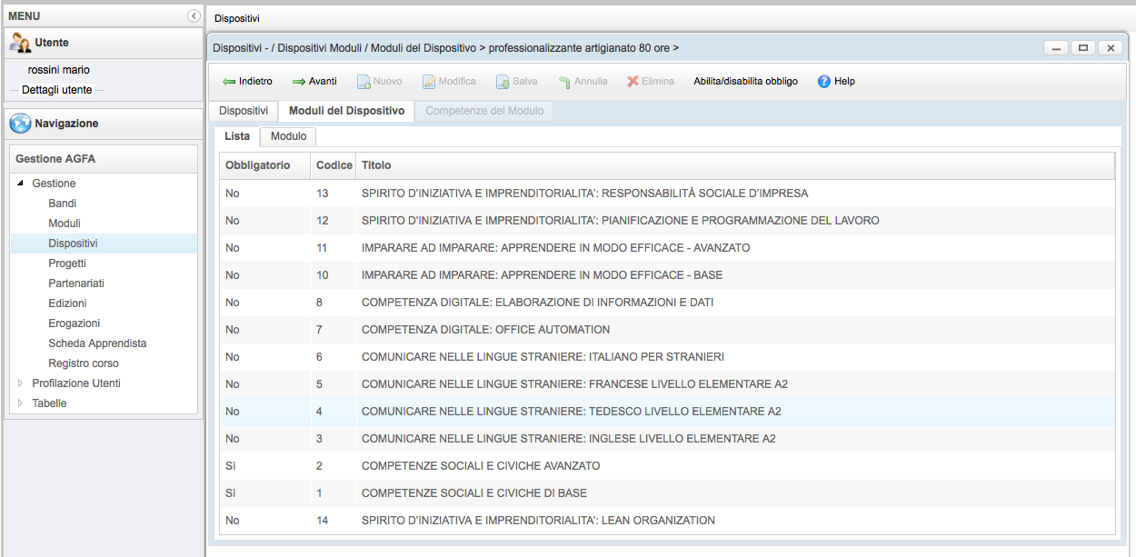 Un tasto ABILITA/DISABILITA OBBLIGO, permette di rendere obbligatorio o meno il modulo selezionato.