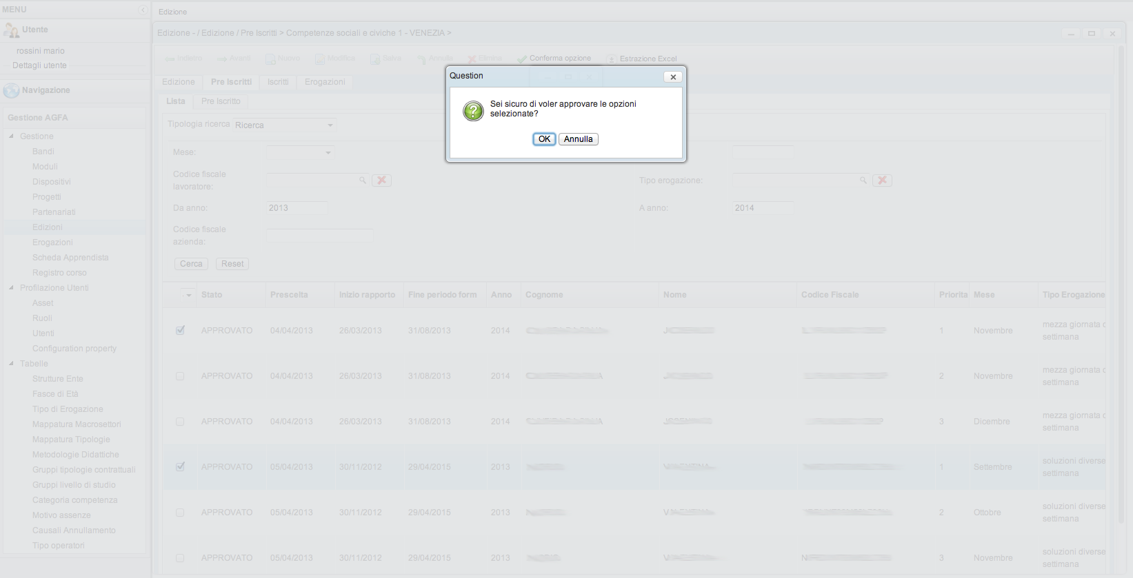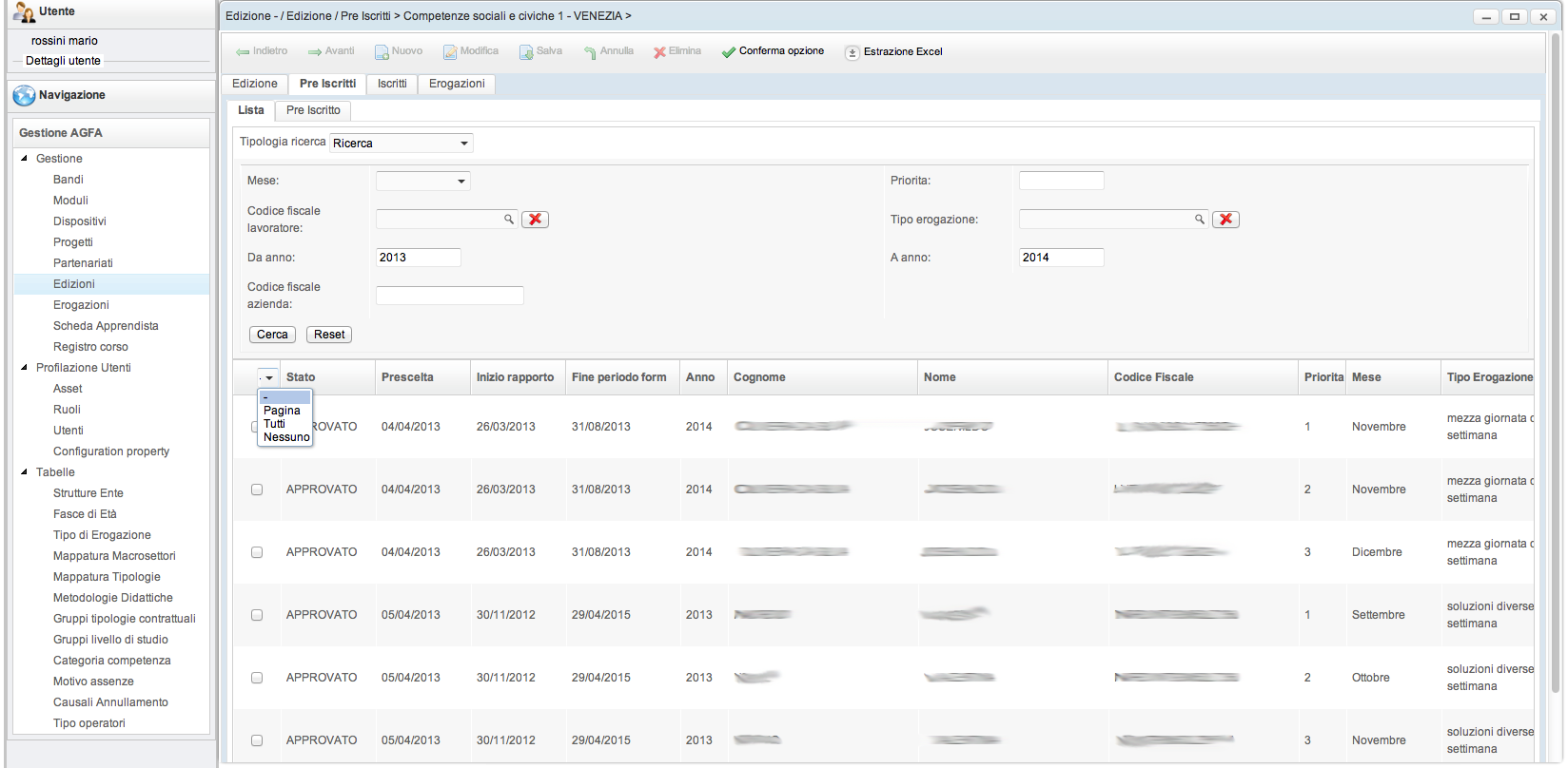 Ogni modifica ai dati dei preiscritti sono disabilitate. Sono stati invece aggiunti 2 tasi: uno per la conferma di una delle opzioni disponibili e uno per l'estrazione dei dati in foglio Excel.