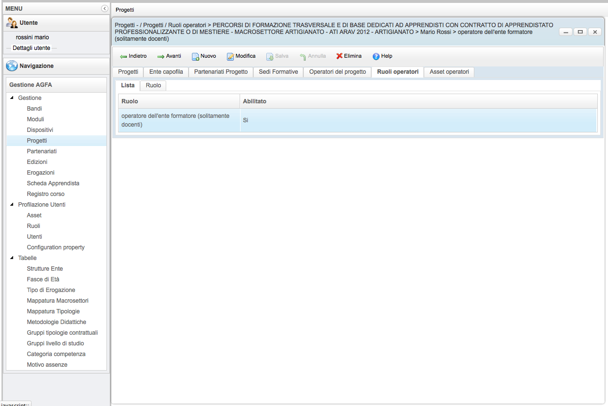 La finestra elenca i ruoli assegnati all'operatore ed eventualmente permette la loro modifica tramite il menù posto in alto.