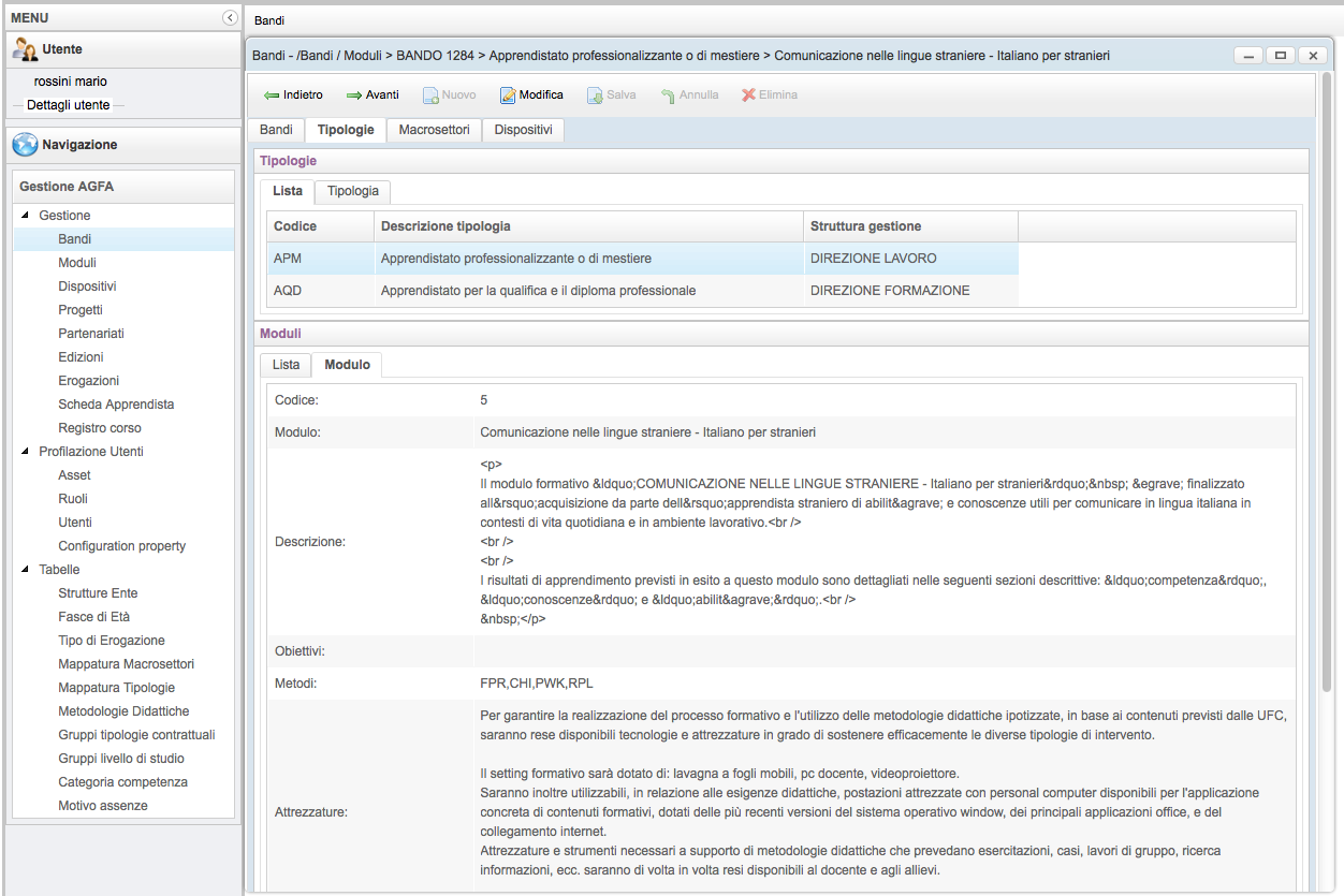 Selezionando una tipologia di bando nel riquadro Tipologie si ottiene la lista dei Moduli: