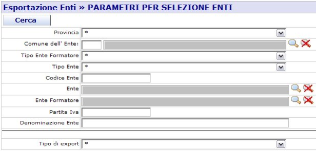 E' possibile eseguire la ricerca per provincia dell'ente (se profilati come Regione), comune (se non si è profilati come comune) e tipo dell'ente, tipo dell'ente formatore (se non si è profilati come ente formatore), codice ente, ente, ente formatore, partita iva dell'ente formatore e denominazione dell'ente.