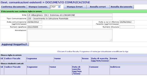 Creata la comunicazione, si continua con l'inserimento dei soggetti collegati a quella comunicazione cliccando sul tasto Aggiungi Soggetti.