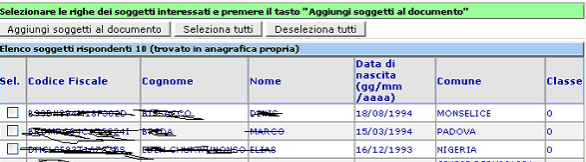 Si metterà la spunta sulla casella "Sel." dello studente interessato. Selezionati tutti i soggetti interessati cliccare "Aggiungi soggetti al documento".