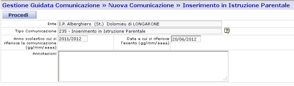 Cliccando sulla riga di interesse del menu (ad es.'Inserimento in Istruzione Parentale') si accede al form dove sarà possibile creare una nuova comunicazione.