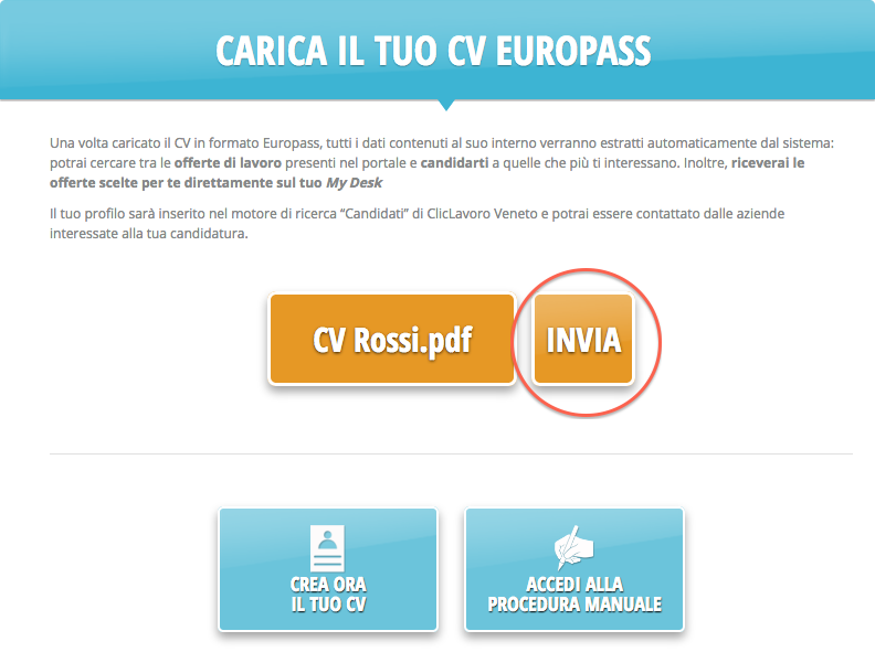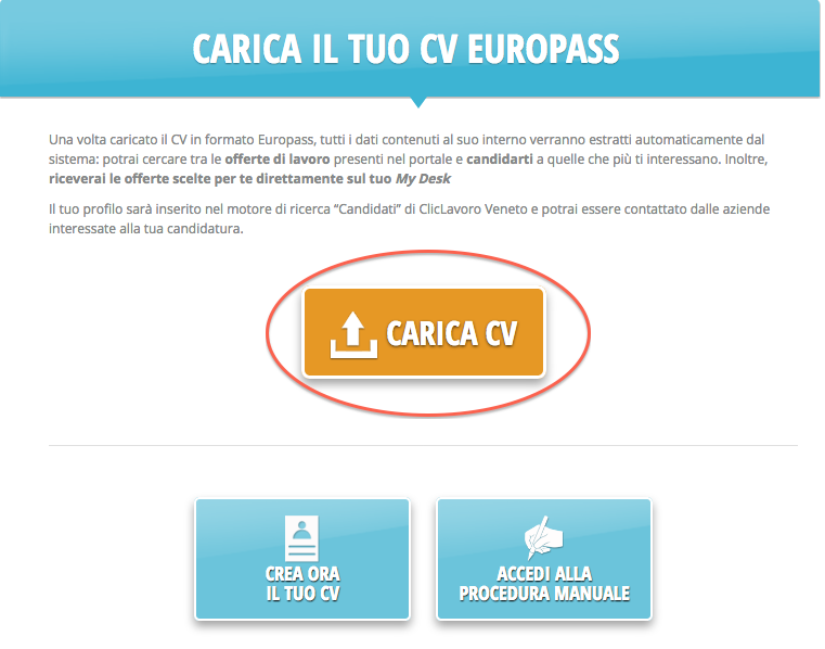 Questa maschera consente di selezionare un file pdf Europass ("Carica CV") e di inviarlo al sistema per essere inserito nell'archivio di CliclavoroVeneto . Le informazioni contenute nel pdf saranno estratte dal sistema e usate per creare una nuova candidatura.