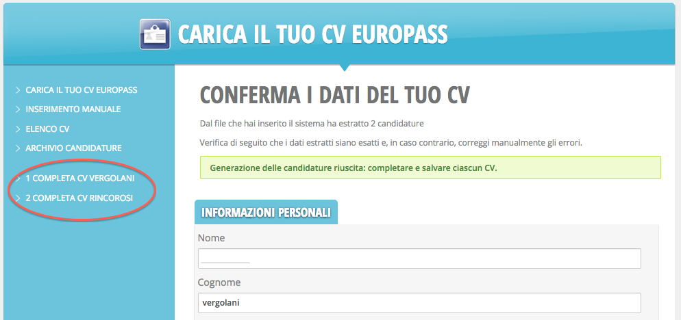 Se, per esempio, il file zip contiene due CV, si creano due voci di menu, una per ciascun CV e appare il primo della lista in modifica. L'operazione di salva bozza, una volta compilate le parti essenziali mancanti, fa sparire il CV dal suddetto elenco e lo inserisce nell'archivio di Cliclavoro Veneto, rendendolo disponibile per il normale iter manuale. Il "salva bozza", se non sopravvengono errori, salva il CV e si posiziona sul successivo della lista. E' altresì possibile eliminare dall'elenco creato un CV attraverso il bottone "elimina bozza".