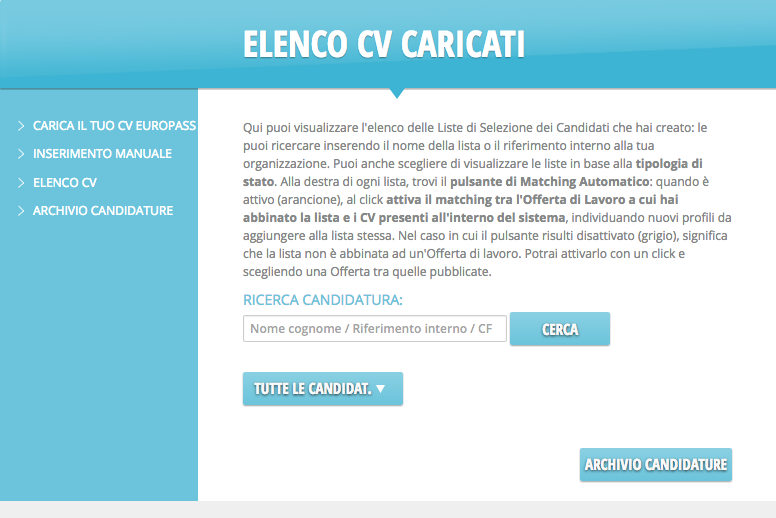Questa è la maschera di ricerca delle candidature (CV). E' possibile ricercare i CV con il tasto cerca, specificando eventualmente dei criteri di filtro nella apposita casellina oppure lo stato dei CV che si vogliono ricercare. Il menu a sinistra consente l'inserimento delle candidature, che può avvenire in due modi: