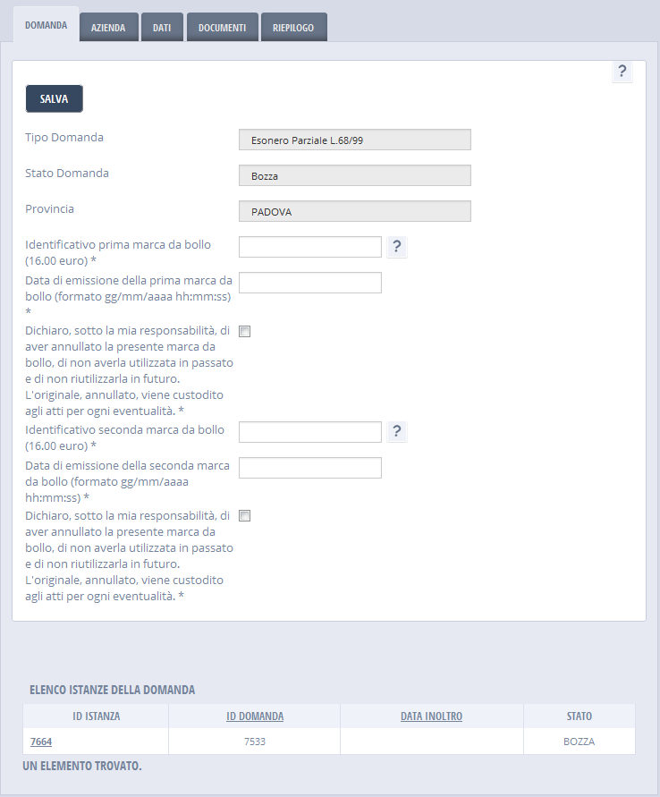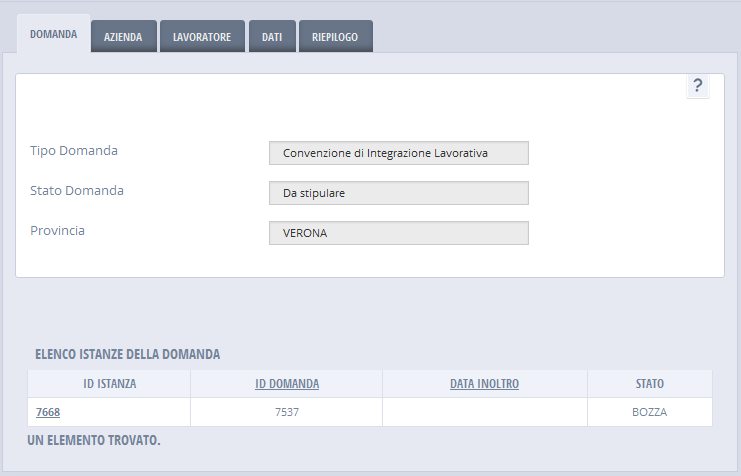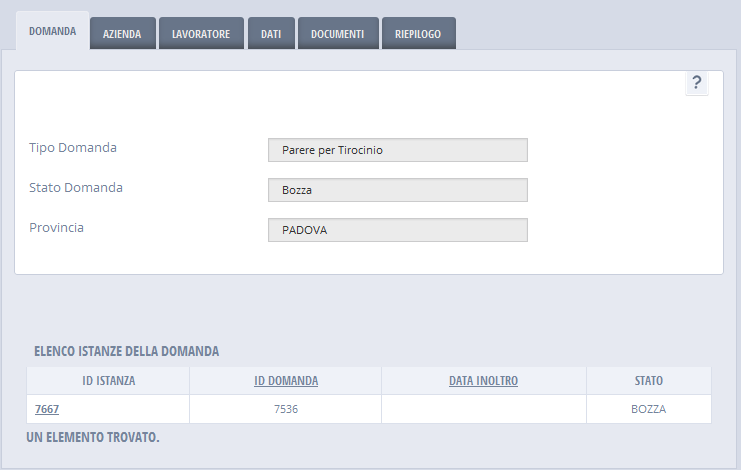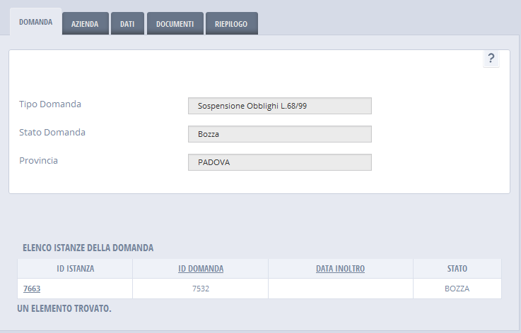 La domanda è accessibile in sola consultazione, a seguito dell'inoltro o a seguito dell'interruzione della stesura.
