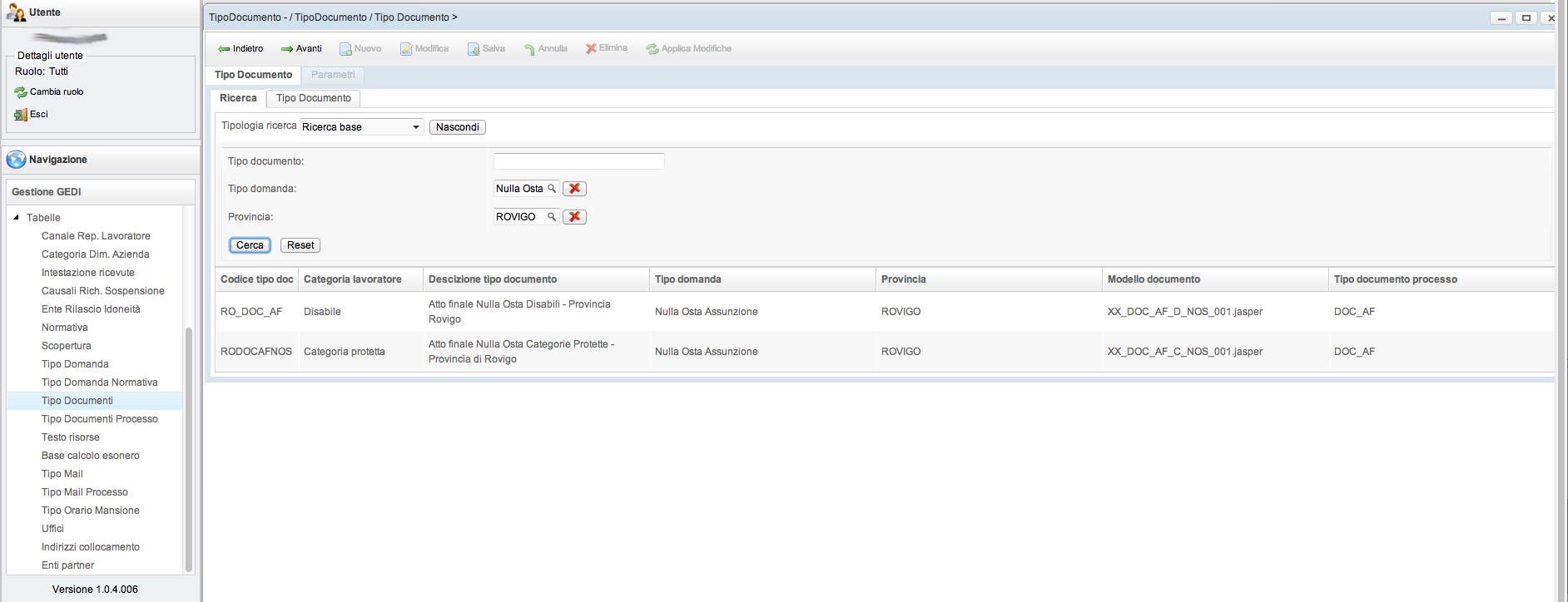 Nella prima pagina vengono elencati tutti i modelli di documenti utilizzati nelle stampe con la possibilità di filtro in base alla provincia o al tipo di pratica.