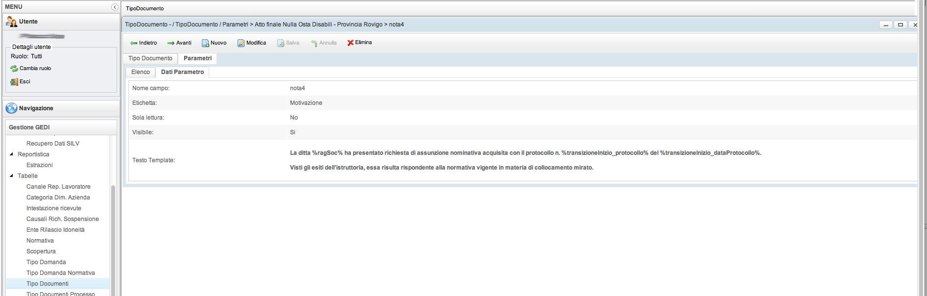 Cliccando sulla riga corrispondente al documento che vogliamo modificare, abiliteremo il pannello "Parametri" che permetterà all'utente di modificare le sezioni del documento in base alle necessità.