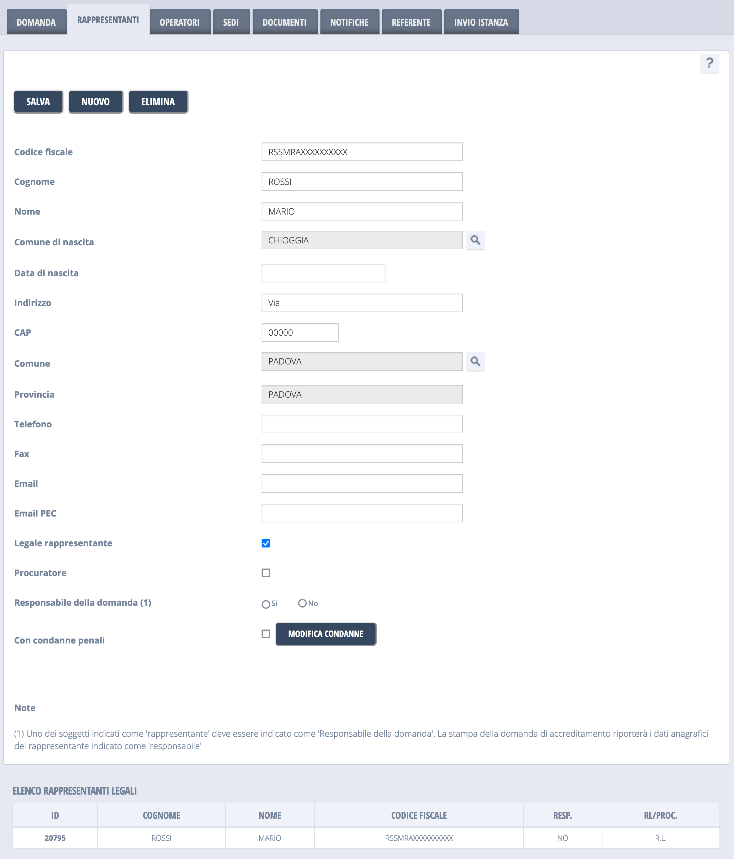 E' inoltre possibile eliminare il rappresentante selezionato, cliccando il tasto "Elimina" o inserire un nuovo rappresentante cliccando il tasto "Nuovo".