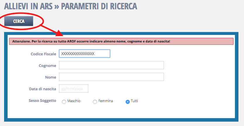 Se la ricerca produce risultato e l'alliev risulta in Ars, si produce un elenco di un unico alunno che è possibile cliccare per visualizzarne la scheda anagrafica, esattamente come accade nella ricerca de i tuoi allievi.