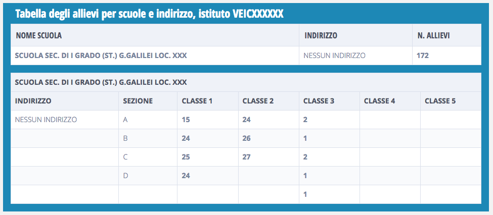 Nel caso di scuola media la colonna "classe 3" rappresenta gli alunni effettivamente in terza. La comunicazione delle iscrizioni a marzo (scelte) comporta che gli alunni in terza comunicati siano spostati in una classe fittizia 0 (zero): in questa situazione, la colonna "classe 3" si svuota. Per visualizzare la ripartizione con la classe zero si consiglia pertanto di abbinare questo schema con quello della pagina principale.
