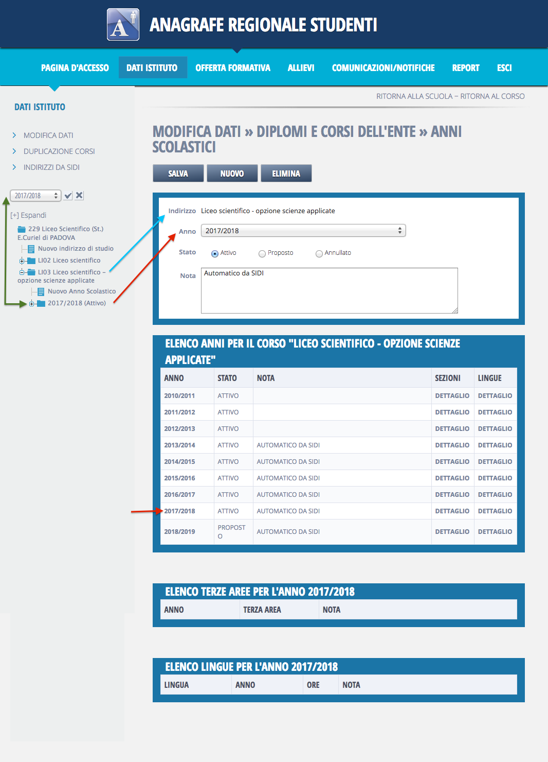 Il secondo riquadro a destra, sotto il form, rapppresenta l'elenco degli anni scolastici associati a ciascun indirizzo