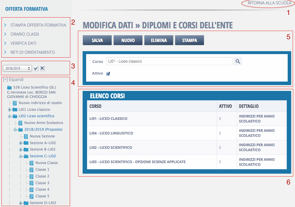Il riquadro (5) è il form di gestione della singola informazione; nell'esempio di figura rappresenta un indirizzo di studi associato alla scuola.