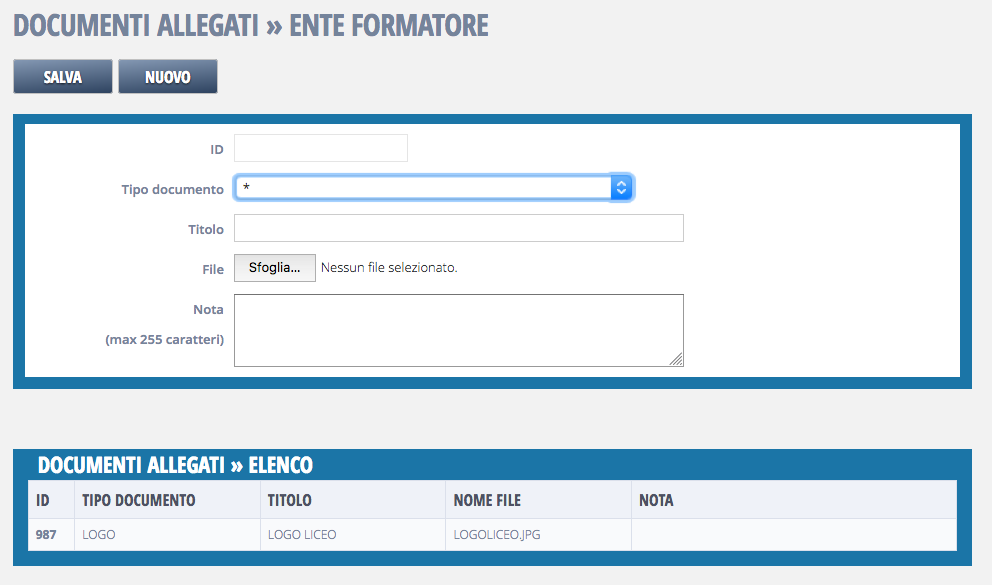 Nella parte superiore è possibile fare l'upload di un file da collegare all'istituto, specificando un titolo e selezionando un tipo tra i seguenti: