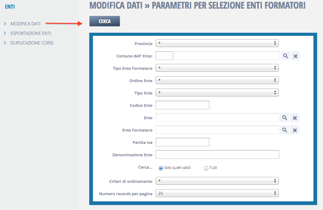 L'operatore può effettuare una ricerca di istituti inserendo dei criteri opportuni e cliccando il tasto cerca