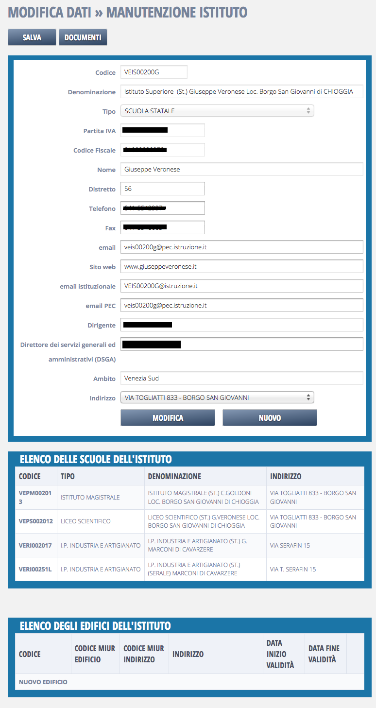 I dati dell'istituto non possono essere modificati dagli operatori delle scuole (ad eccezione dell'indirizzo). Le modifiche a tali dati sono operate dall'amministratore del sistema o dagli uffici preposti.