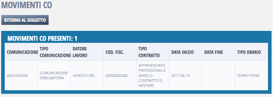 Questa funzione serve per consultare i movimenti - ovvero le comunicazioni - CO Veneto. Utile per la verifica di inserimento in percorsi di apprendistato, per esempio.