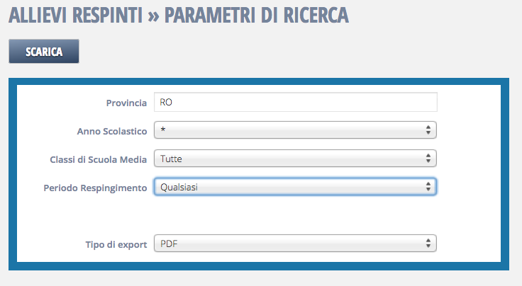 Il report dei Respinti evidenzia il numero di allievi che sono stati respinti a fine anno. Il form di ricerca consente alcune opzioni di filtro, come esemplificato nella figura seguente.