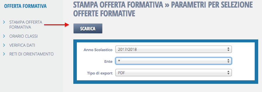 La voce di menù stampa offerta formativa consente di stampare la situazione degli indirizzi di studio che costituiscono appunto l'offerta formativa in un certo anno scolastico. La stampa si esegue selezionando l'anno scolastico, la scuola di interesse ed il tipo di output: file pdf, foglio Excel oppure semplice testo (tab separated).