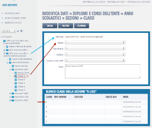 Gestione classe Su ciascuna sezione vanno definite le classi attive. Espandendo, nell'albero di navigazione una sezione si evidenzia l'elenco delle classi … delle classi già associate ad una certa sezione.