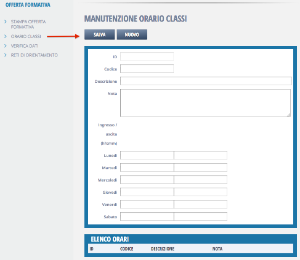 Orario classi La voce Orario classi consente di gestire gli orari di ciascuna classe. Il form di manutenzione contiene le seguenti informazioni Codice una codifica arbitraria assegnata dall'operatore. Per esempio: "20171A" Descrizione una descrizione dell'orario. Per esempio "Orario della prima A 2017/2018" Nota una
