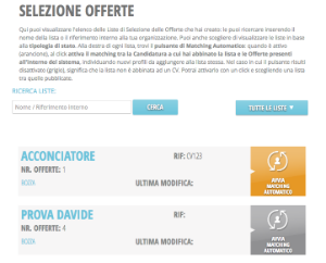 Liste di selezione offerte La voce di menù "liste offerte" porta ad una maschera di ricerca delle proprie liste di offerte di lavoro. E possibile cercare i le offerte per nome o per riferimento interno dell'offerta, nonché per stato della lista. Il clic sul tasto "cerca" produce un elenco di offerte di lavoro che