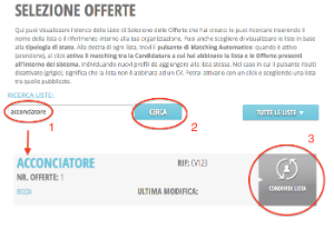 Condividi lista di offerte Per condividere una lista di offerte di lavoro occorre cercare le liste di interesse (2) eventualmente restringendo il criterio di ricerca (1) e poi cliccare su "condividi lista" (3). Quando compare l'elenco degli utenti, selezionare l'utente con cui si vuole condividere la lista