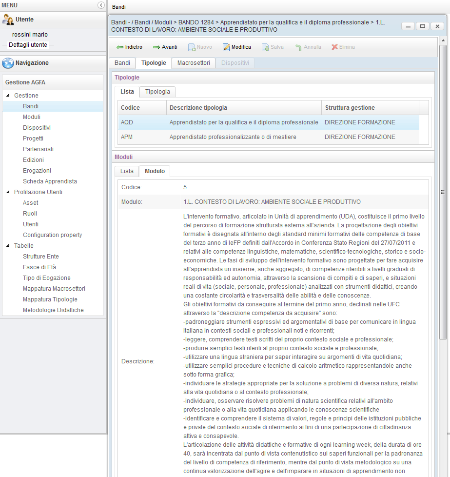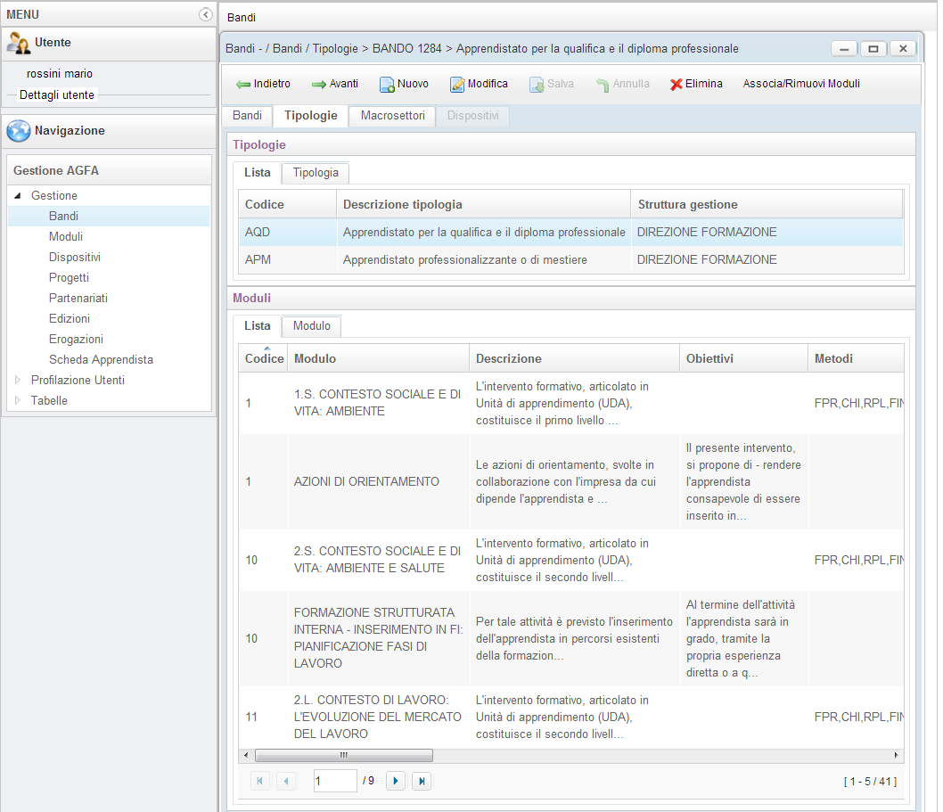 Selezionando una tipologia di bando nel riquadro Tipologie si ottiene la lista dei Moduli: