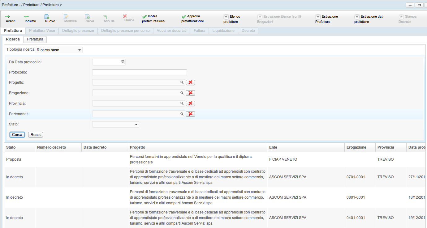 Con la maschera ricerca proposta è possibile effettuare una ricerca delle prefatture già inserite ed in fase di lavorazione.